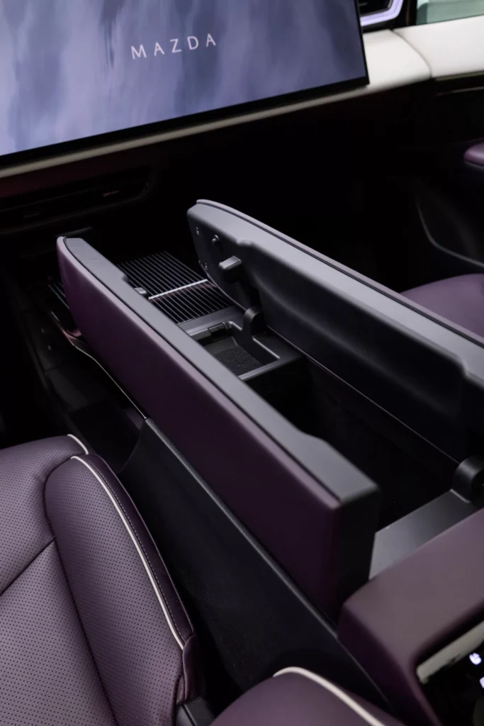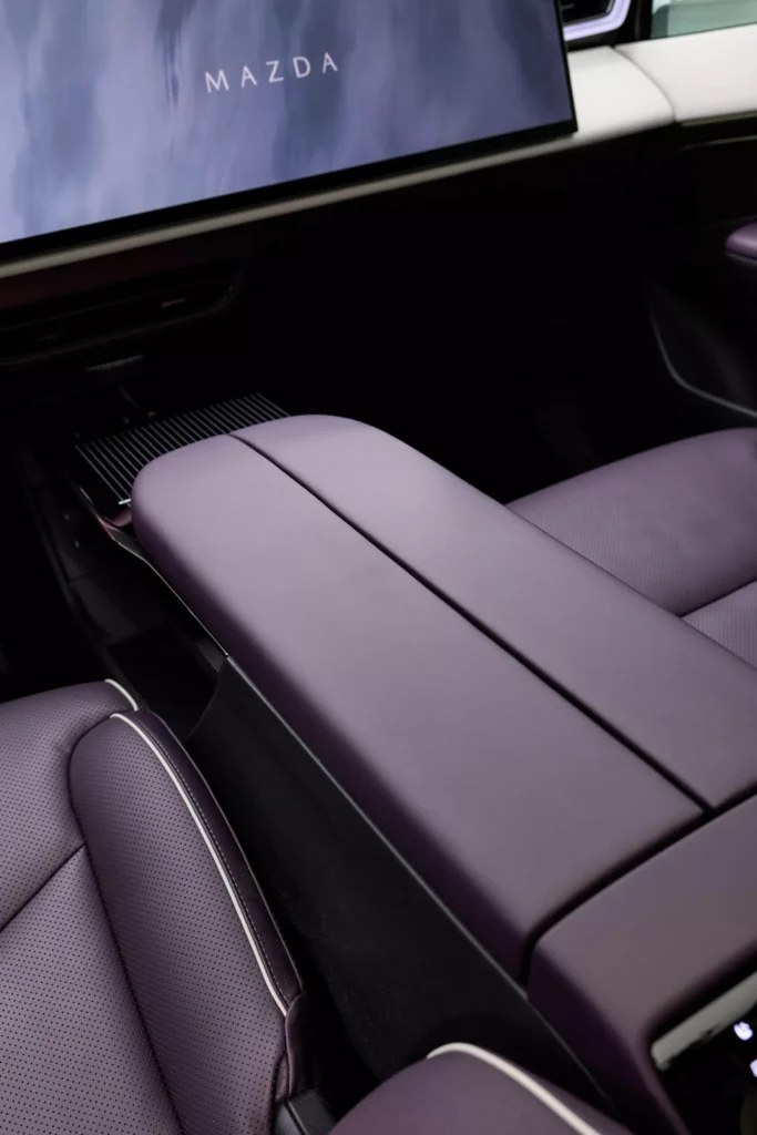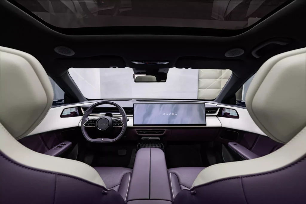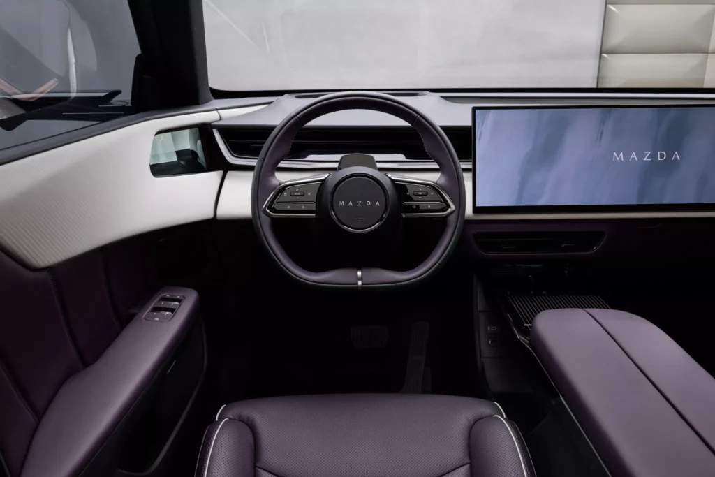 Interiér CX-6e není typický pro vozy značky Mazda, jelikož se tady táhne přes celou palubní desku 26palcový dotykový displej, proto nejsou potřeba žádná fyzická tlačítka, a místo přístrojového štítu je head-up displej. Krom toho infotainment nabízí ovládání gesty, vícejazyčné rozpoznávání hlasu, reproduktory v opěrkách hlavy a místo klasických zpětných zrcátek jsou kamery promítající obraz na displeje ve dveřních výplních. Je to vše vstříc budoucnosti, ale bohužel do typické Mazdy to má daleko… nebo je to jen o zvyku? Z ceníku bude možné si vybrat jeden ze sedmi nabízených odstínů karoserie, přičemž v čele bude fialový Nightfall Violet. To je sytý a lesklý odstín, který se v závislosti na osvětlení mění mezi zářivě fialovou záři a téměř černé stíny.