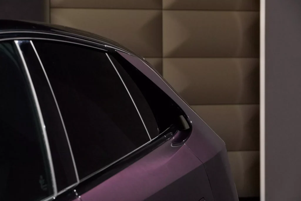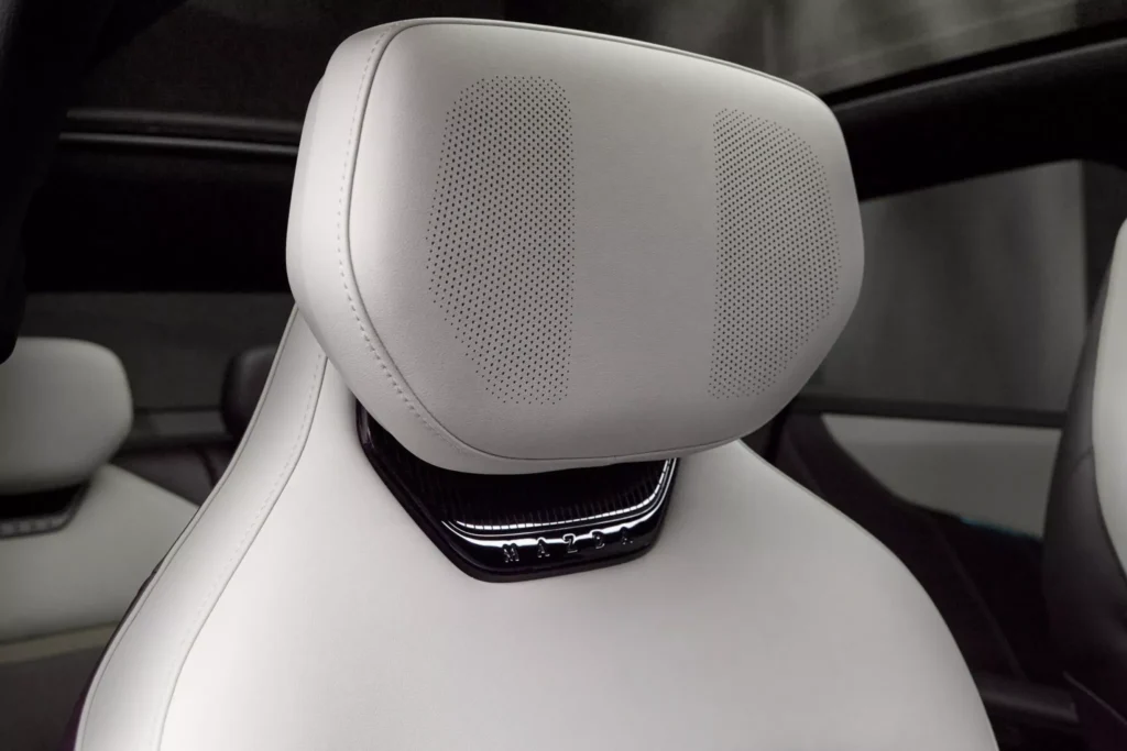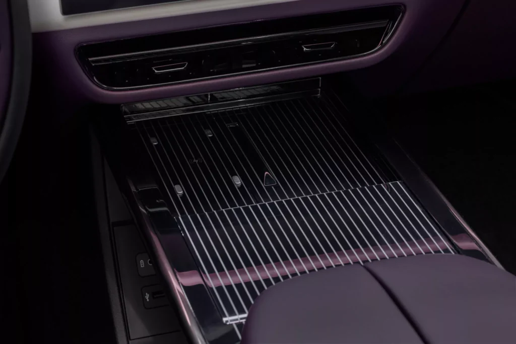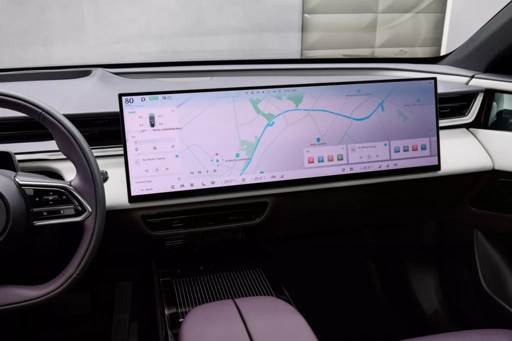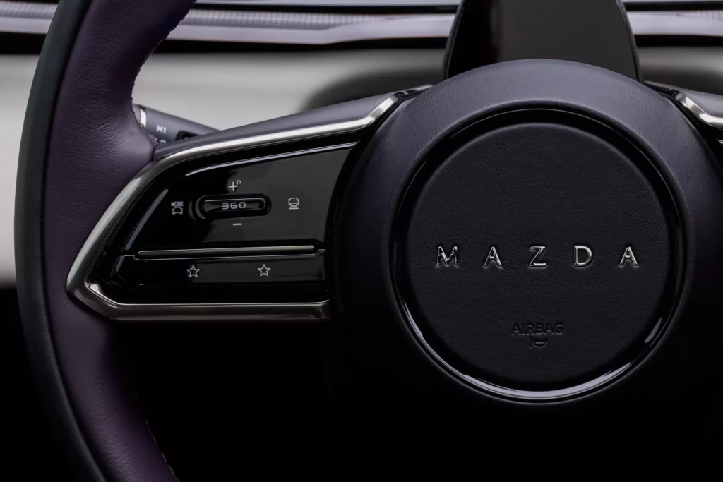 Interiér CX-6e není typický pro vozy značky Mazda, jelikož se tady táhne přes celou palubní desku 26palcový dotykový displej, proto nejsou potřeba žádná fyzická tlačítka, a místo přístrojového štítu je head-up displej. Krom toho infotainment nabízí ovládání gesty, vícejazyčné rozpoznávání hlasu, reproduktory v opěrkách hlavy a místo klasických zpětných zrcátek jsou kamery promítající obraz na displeje ve dveřních výplních. Je to vše vstříc budoucnosti, ale bohužel do typické Mazdy to má daleko… nebo je to jen o zvyku? Z ceníku bude možné si vybrat jeden ze sedmi nabízených odstínů karoserie, přičemž v čele bude fialový Nightfall Violet. To je sytý a lesklý odstín, který se v závislosti na osvětlení mění mezi zářivě fialovou záři a téměř černé stíny.