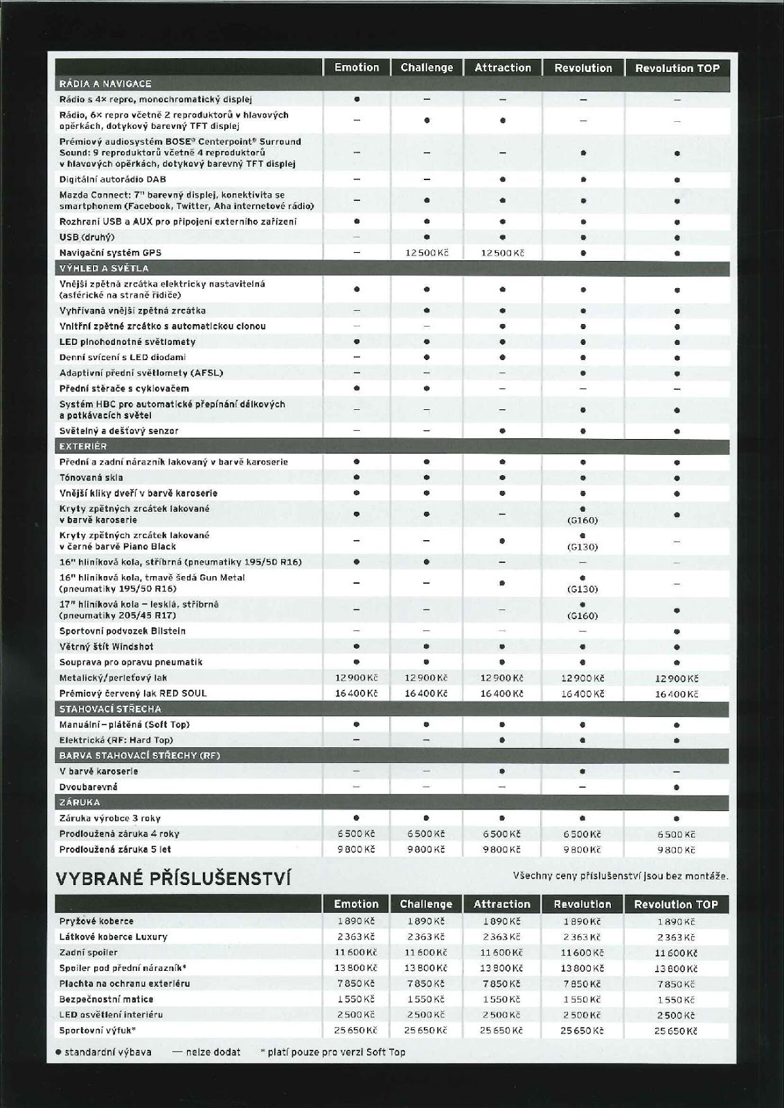 Pokud si nevzpomenete, tak připomínám, že Mazda MX-5 startuje na částce 629 900 Kč s benzínovou patnáctistovkou. Kompletní ceny naleznete zde. Co se týče nové MX-5 RF, základní cena byla stanovena na 779 900 korun, za kterou dostanete 1,5litrový benzínový čtyřválec SkyActiv-G o výkonu 131 koní, šestistupňový manuál a výbavový stupeň Attraction. Jak už jste určitě zvyklí u ostatních modelů, začínají od výbavy Emotion, ale MX-5 RF pro změnu od Attraction.