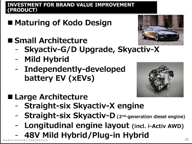 Prezentace i prozradila, že je v plánu vývoj designového jazyka Kodo, představení hybridní soustavy, platformy EV a právě také nový podvozek s možností PHEV. Vypadá to, že pohon zadních kol bude standardem a pravděpodobně motory budou umístěny podélně. Veškeré prvky dané revoluce jsou nazývány interně „New Generation“ a lze je tak očekávat mezi roky 2020 a 2025. Úplně první vlaštovkou má být právě nová Mazda 6, která by měla vzhledem vycházet z konceptu Vision Coupé.