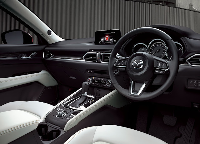 Kabina CX-5 vychází z větší CX-9, což je znát na nižší přístrojové desce a přehledném zvýšeném středovém tunelu. Active Driving Display, neboli head-up displej, promítá upozornění a údaje přímo na čelní sklo a CX-5 je tak první Mazdou, která to nabízí v Japonsku. Ano, úplně první, tzv. průkopník, byla CX-9, ale ta se bohužel na domácím trhu neprodává. Sedmipalcový displej infotainmentu MZD Connect je nově samostatný člen palubní desky, kdežto spolupracující barevný LCD displej o velikosti 4,6 palce byl přepracován pro lepší čitelnost. V A-sloupcích zaujmou malé reproduktory a úzké výdechy. Samotná sedadla byla taky vylepšena a nabídnou tak nově větší pohodlí.