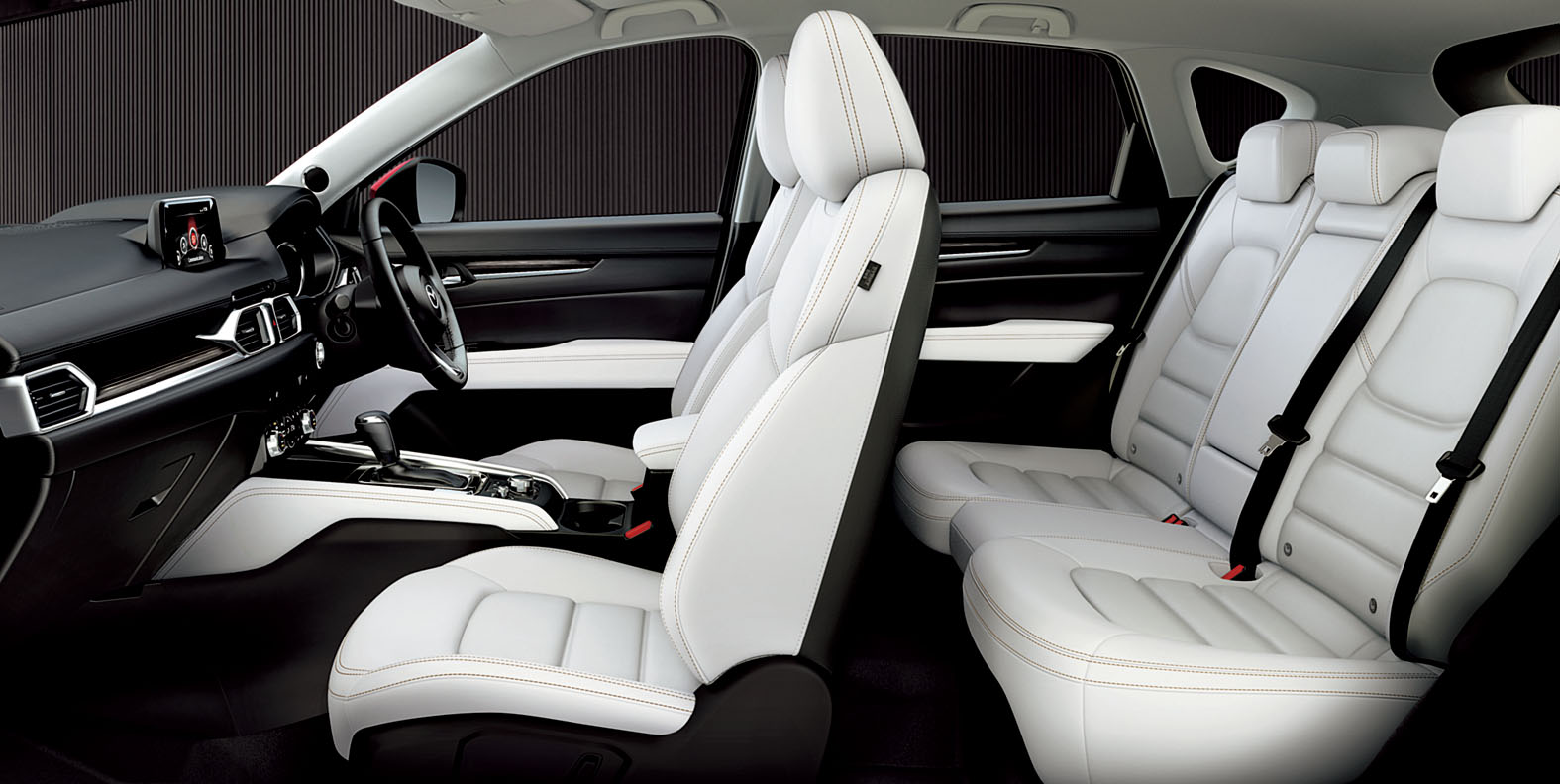 Kabina CX-5 vychází z větší CX-9, což je znát na nižší přístrojové desce a přehledném zvýšeném středovém tunelu. Active Driving Display, neboli head-up displej, promítá upozornění a údaje přímo na čelní sklo a CX-5 je tak první Mazdou, která to nabízí v Japonsku. Ano, úplně první, tzv. průkopník, byla CX-9, ale ta se bohužel na domácím trhu neprodává. Sedmipalcový displej infotainmentu MZD Connect je nově samostatný člen palubní desky, kdežto spolupracující barevný LCD displej o velikosti 4,6 palce byl přepracován pro lepší čitelnost. V A-sloupcích zaujmou malé reproduktory a úzké výdechy. Samotná sedadla byla taky vylepšena a nabídnou tak nově větší pohodlí.