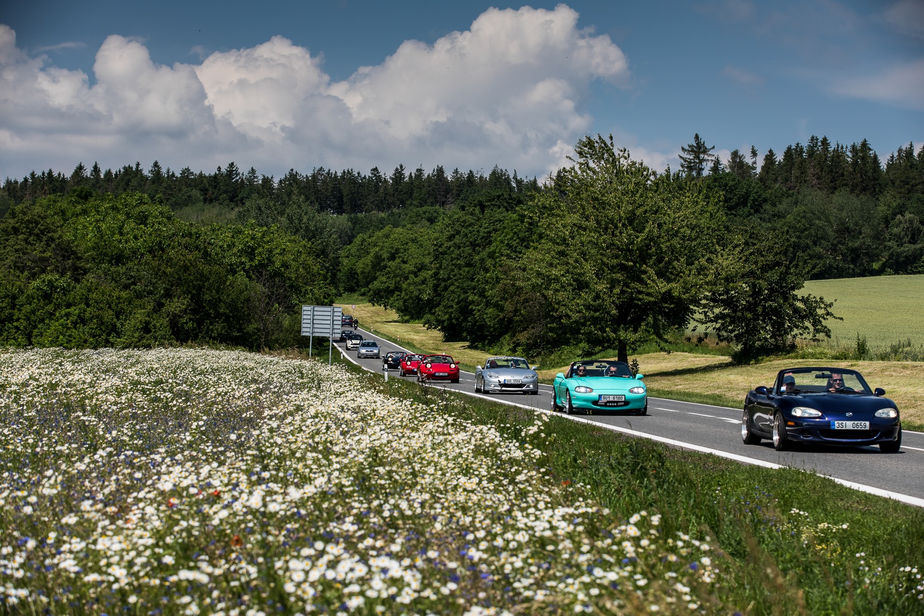Plán cesty byl předem jasný, takže jsme vyjeli na Ždírec nad Doubravou, Slatiňany, Chrudim, Pardubice, Hradec Králové a poté přímo Česká Skalice. Užívali jsme si každý kilometr se staženou střechou a těšilo nás, že jsme zaujali i kolemjdoucí. Čím blíž jsme byli místu velkého srazu, tím víc jsme potkávali nějaké MX-5 a pochopitelně adrenalin v žilách stoupal.