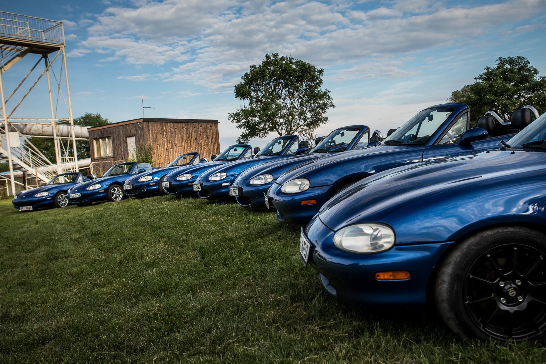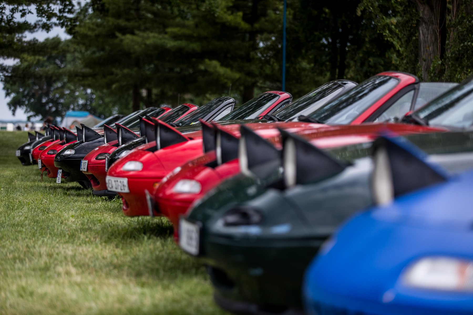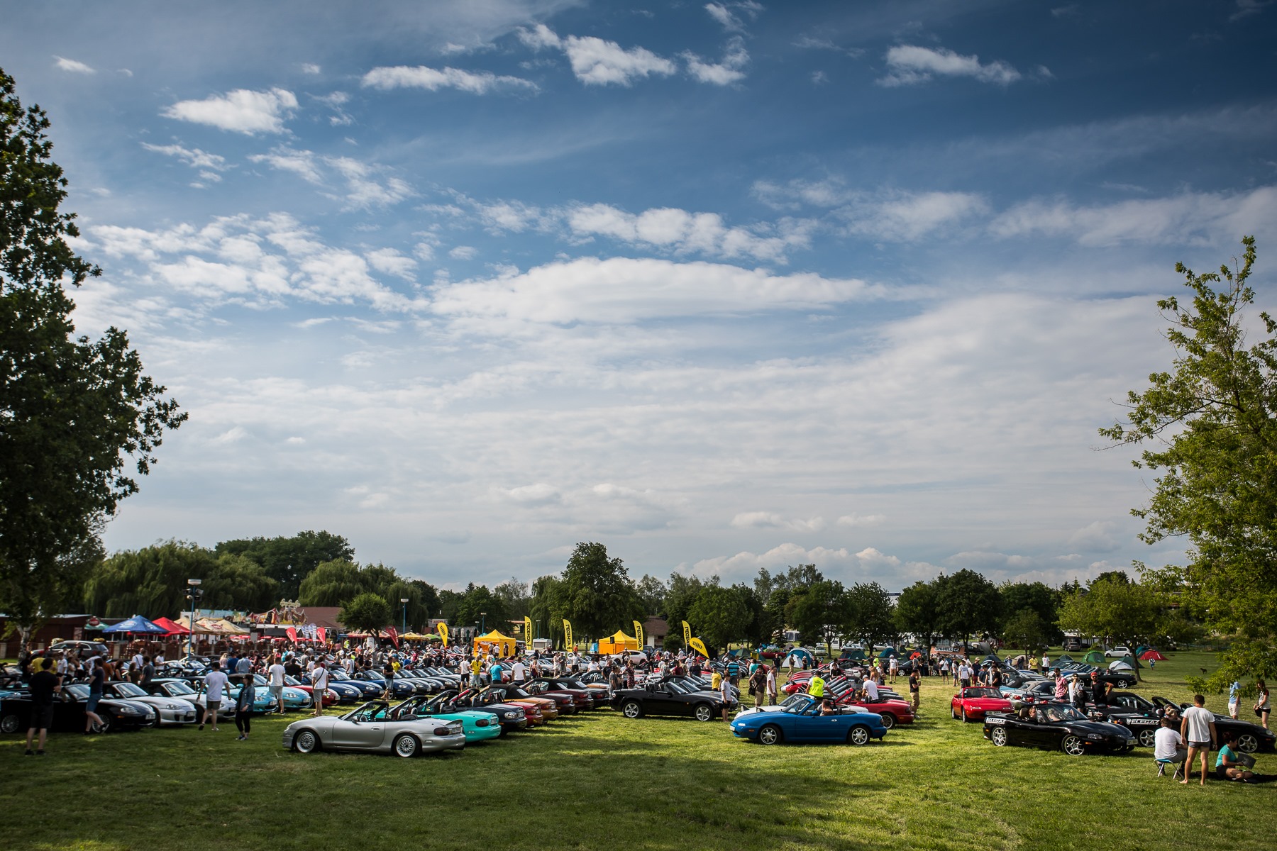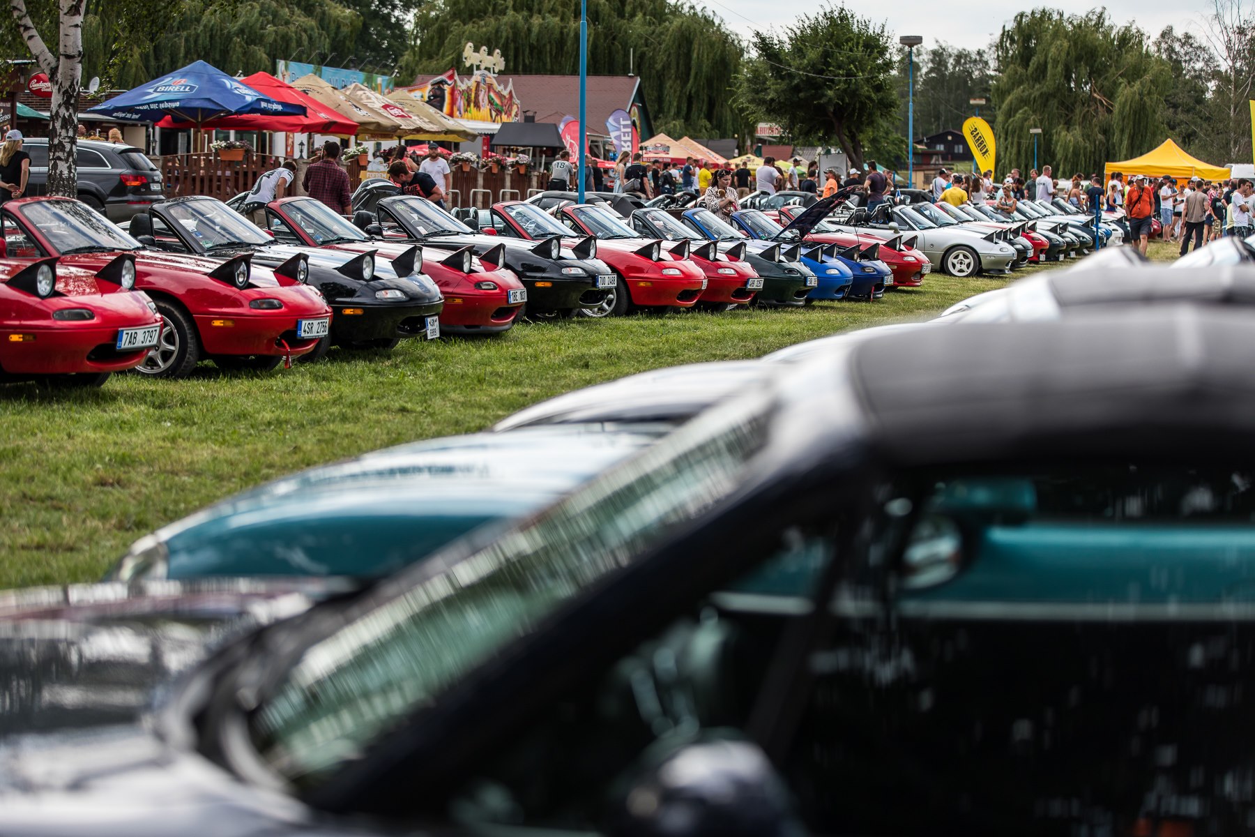 Pomalým tempem jsme projížděli celým kempem a potkávali houfy lidí, takže už tady mě napadlo, že to bude opravdu velká akce. Dojeli jsme k hlavní ploše a zde se nás ujali členové organizačního týmu a vysvětlili nám, že se parkuje podle dané generace, takže já jsem zavítal do první řady a kolega Milan zase do druhé. Ale řeknu Vám, vidět tolik MX-5 pohromadě při západu slunce a k tomu i davy lidí, které se baví společně a nedělají rozdíly na autech, to je zkrátka něco úžasného. Prohodil jsem pár slov s lidmi, které znám z předchozích srazů a postupně si procházel jednotlivé exponáty srazu. Nemohl jsem opomenout samozřejmě ani přihlášení do bohaté tomboly a na projížďku či slalom. Bohužel na slalom byla už kapacita naplněna, tak alespoň jsem se přihlásil k ranní projížďce. Pozdní večer pak přinesl víceméně dlouhé debaty u piva či seznamování, ale i těšení na sobotu.