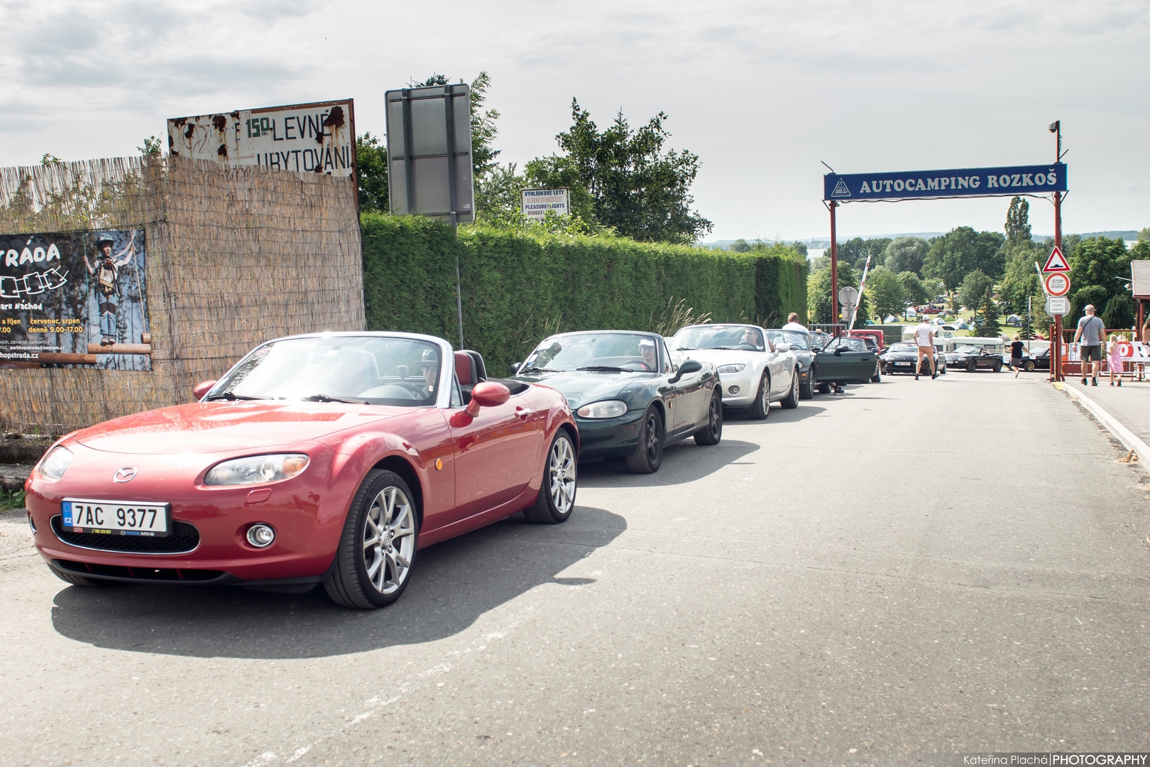 Zhruba kolem osmé hodiny večerní jsme se ocitli před vstupní bránou ATC Rozkoš a uviděl jsem Michala Švaňka, jednoho z hlavních organizátorů, jak vítá přijíždějící účastníky srazu. Poté zahlédl mě a už jsem slyšel radostným hlasem z dálky: „Ty vole, Jiřino…“. Mezitím jsem k němu dojel a hned mi dal záludnou otázku, konkrétně, abych si tipl, kolik MX-5 už dorazilo. Tak střelil jsem od boku, že tak 200 a on: „To zase ne, ale ty jsi konkrétně 161. v pořadí a kolega za tebou 162., neskutečný na pátek“. Po předání vstupného a dárkové tašky jsme byli posláni do zadní části kempu na hlavní plochu, kde stojí ostatní MX-5.