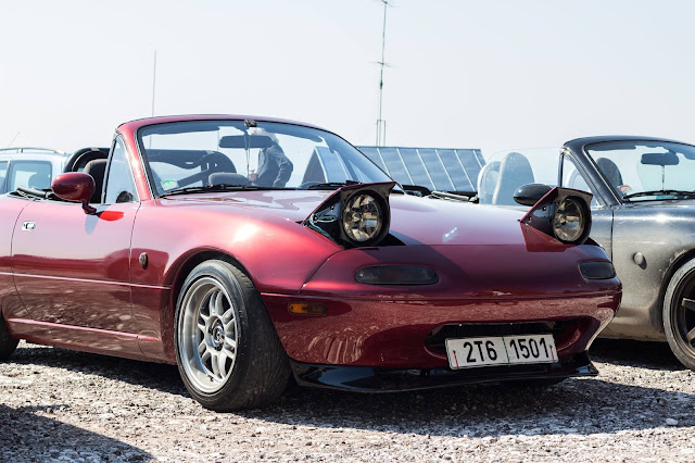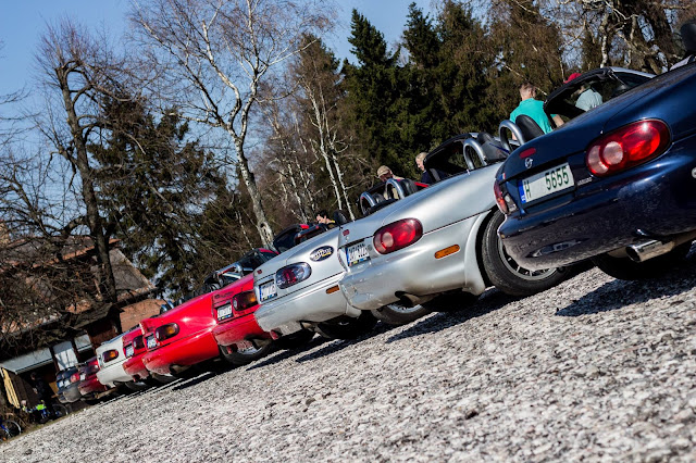 Jak už jsem zmínil v předchozím odstavci, slušné zastoupení měly všechny generace Mazdy MX-5, a to díky klukům z Guru Racing Garage, jmenovitě Michalovi a Oťasovi Švaňkovi, kteří dojeli též se svými Miatkami. Oťas se přijel pochlubit MX-5 (NA) s kompresorem, pokud Vás zajímají nějaké ty parametry, tak přeplňované NA disponuje výkonem cirka 230 koní a krouticím momentem 270 Nm. Oťas si také neodpustil poznámku, že jeho kára doslova „mňouká“ a kolemjdoucí div neskáčou do mezí (smích). Co se týče Michala, ten má též vymazlené NA, avšak se sériovou šestnáctistovkou 85 kW. Dvojici doprovázela desítka členů z MX-5 klubu, dokonce i Adam Sandmann z rodinné půjčovny kabrioletů iCabrio, který dorazil bílým NA. Mě osobně zaujalo NA s netradičními světly a unikátní vínovou barvou, která se dávala na NC, jež se prodávala pouze v Kanadě.