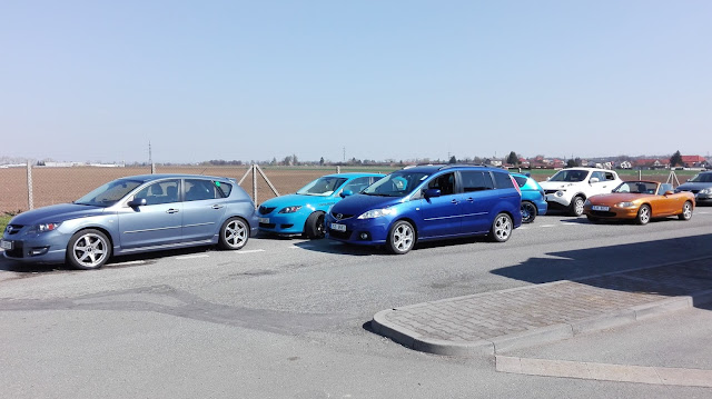 Začátek srazu byl naplánován na pravé poledne, a proto se pětičlenná parta Mazdařů, včetně mě, z Jižních Čech a Vysočiny domluvila na půl desátou v Havlíčkově Brodě – pravda, zpoždění se dostavilo. Takže nakonec jsme vyrazili kolem desáté hodiny směr Hradec Králové a nutno říci, že po cestě nebyla nuda, neboť nahánět se v MX-5 (NB) s Mazdou 3 MPS (BK) na průtazích, nic příjemného (smích). Dále s námi jely dvě Mazdy 3 (BK) a Mazda 5 (CR).