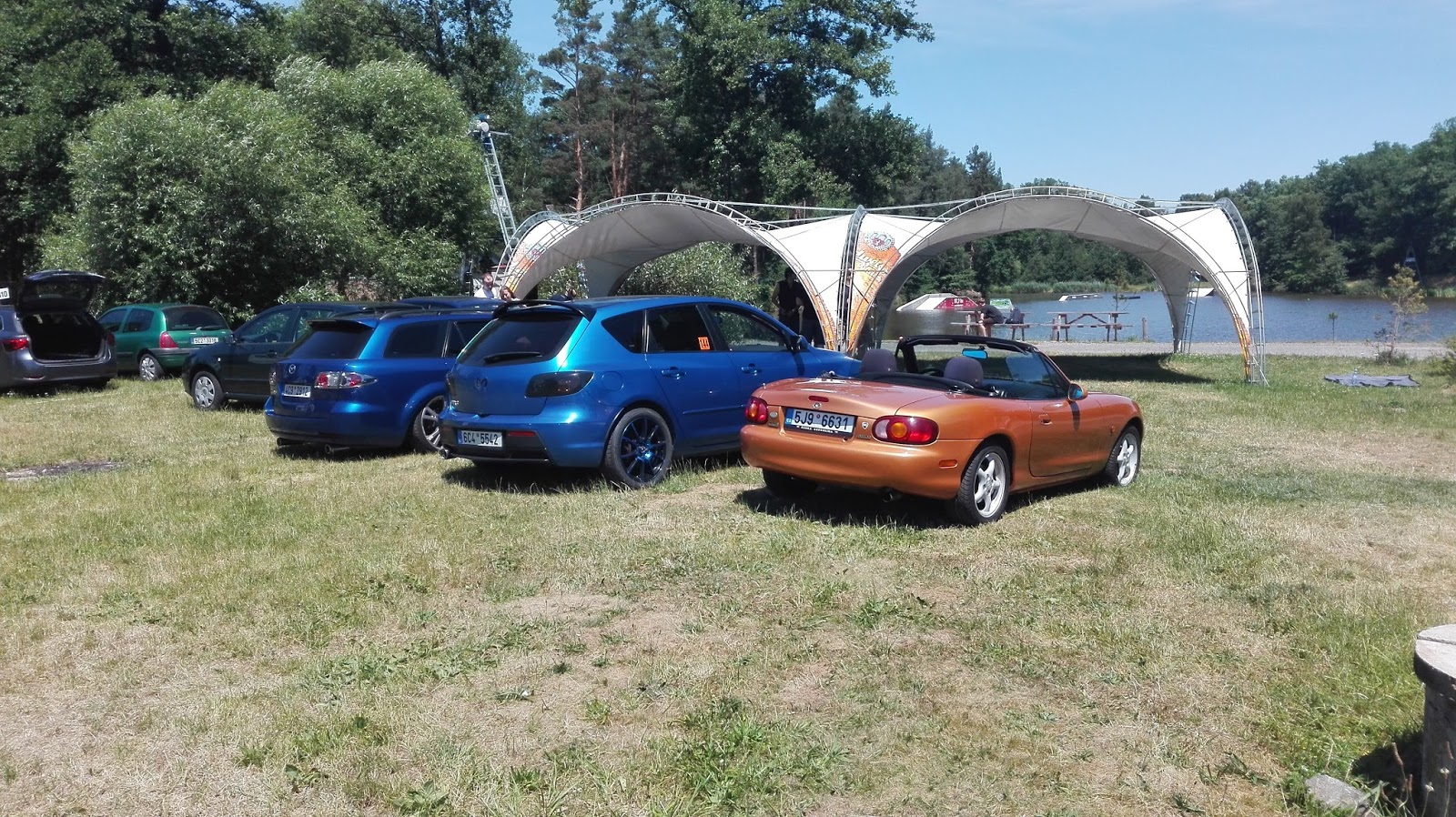 Bohužel poslední červnový víkend neměl nikdo čas z Vysočiny, a proto jsem vyjel sám společně s Mazdou MX-5. Cca 100 km dlouhá trasa by utekla voda, kdyby však po cestě nebyly objížďky a cesta se tak neprotáhla. Jihočeský sraz se konal nedaleko dálnice D3, přesněji v kempu ATC Karvánky, kousek od Soběslavi. Se svou „Miou“ jsem dorazil na místo po poledni a sraz byl pochopitelně v plném proudu. Sotva jsem zaparkoval u ostatních Mazd, už mě vítal Míra a po chvíli i Milan.